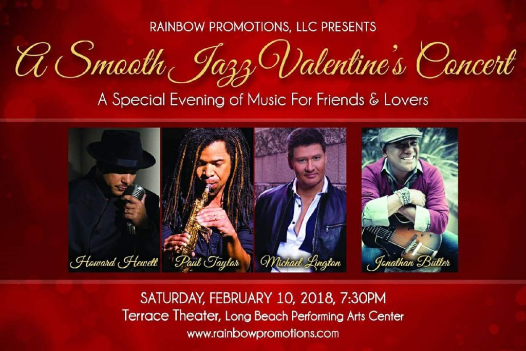 On February 10th, 2018 Rainbow Productions will present a Smooth Jazz Valentine Day’s Concert from 7:30 pm – 11 pm, starring Howard Hewitt, Jonathan Butler, Michael Lington, and Paul Taylor at the Terrace Theater, Long Beach Performing Arts Center.  Come out and hear these fabulous artists perform the music that will put everyone in the mood for love.